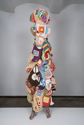 I find Cave's meticulous use of ephemera/found object and textiles to be utterly inspiring, the textures, hues and scale are rather overwhelming and incredibly fantastical, reminiscing childhood daydreams and nightmares alike. Here the artist amalgamates ideas associated with textile production and handcrafts, whilst assimilating the modern preoccupation with the inclusion of found object to facilitate a dialogue pertaining to rather adult subjects, shadowed by childlike naivety and awe therefore I believe making the message even more poignant.